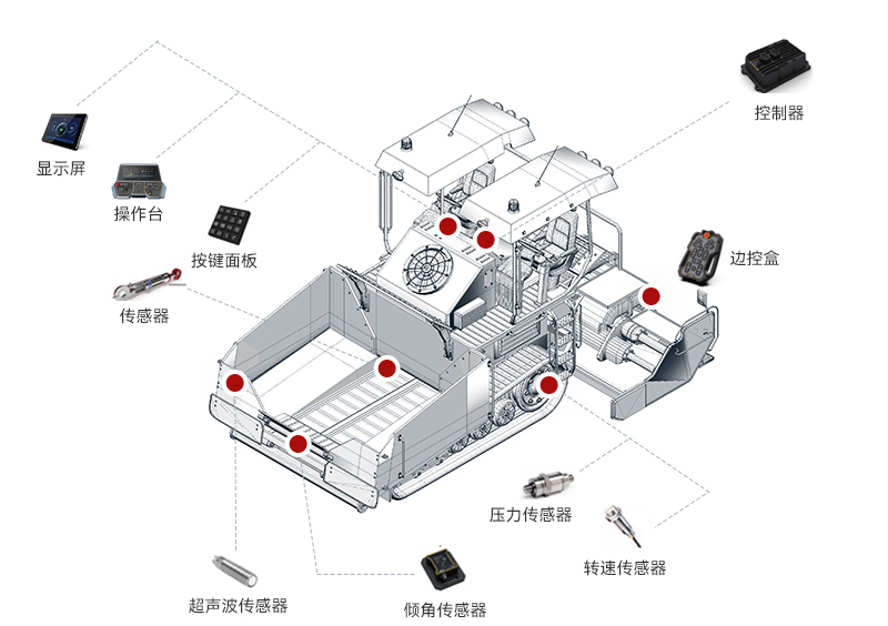 金年金字招牌(jinnian)智能摊铺机解决方案整合了感知技术、自动控制系统和数据分析算法,实现了摊铺机高度智能化操作。通过实时获取路面信息和实时调整施工参数,使摊铺机操作更加精准、高效和可靠。